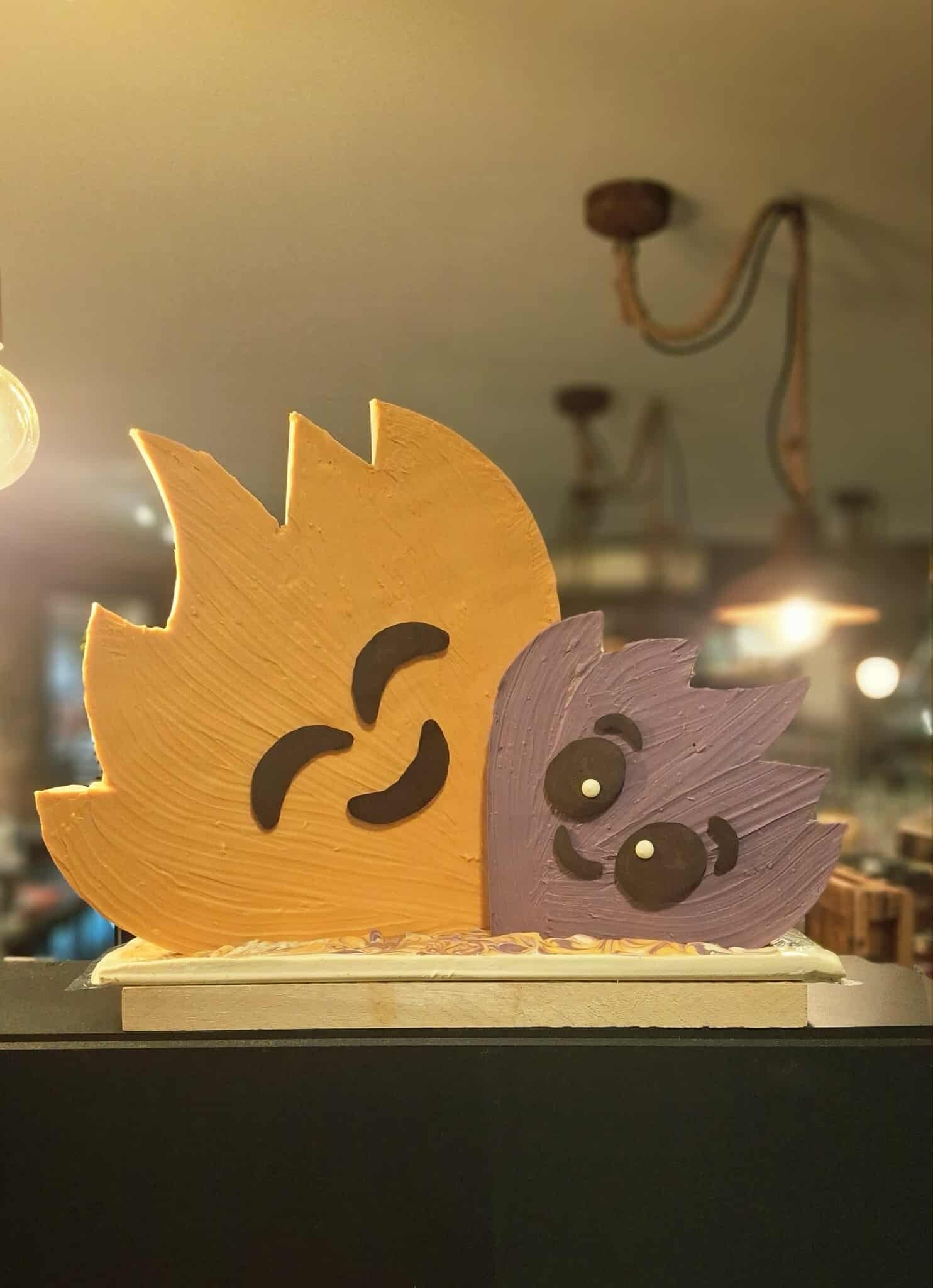 een handgemaakt chocolade pronkstuk van ongeveer 7 kg, opgebouwd uit pure chocolade in de vorm van twee vlammen, het symbool van warmte, zorg en verbondenheid.